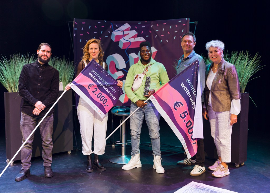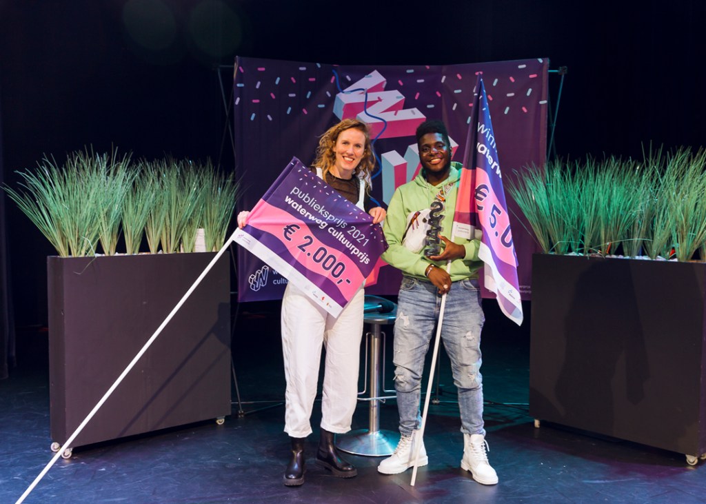 🌊 Eugène Biffé met zijn project Schiedam Inside Out. Hij won de Waterweg Cultuurprijs 2021, bestaande uit €5.000 én een beeld van kunstenaar Dike Hof.