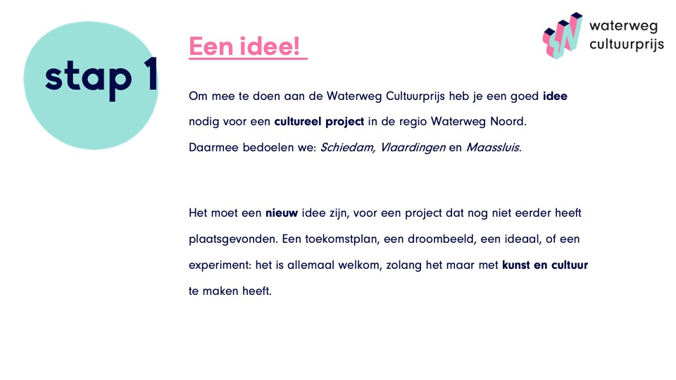 Vanaf 15 juni kun je je jouw idee voor een cultureel of kunstzinnig project in de regio Schiedam, Vlaardingen en Maassluis insturen via het inschrijfformulier
